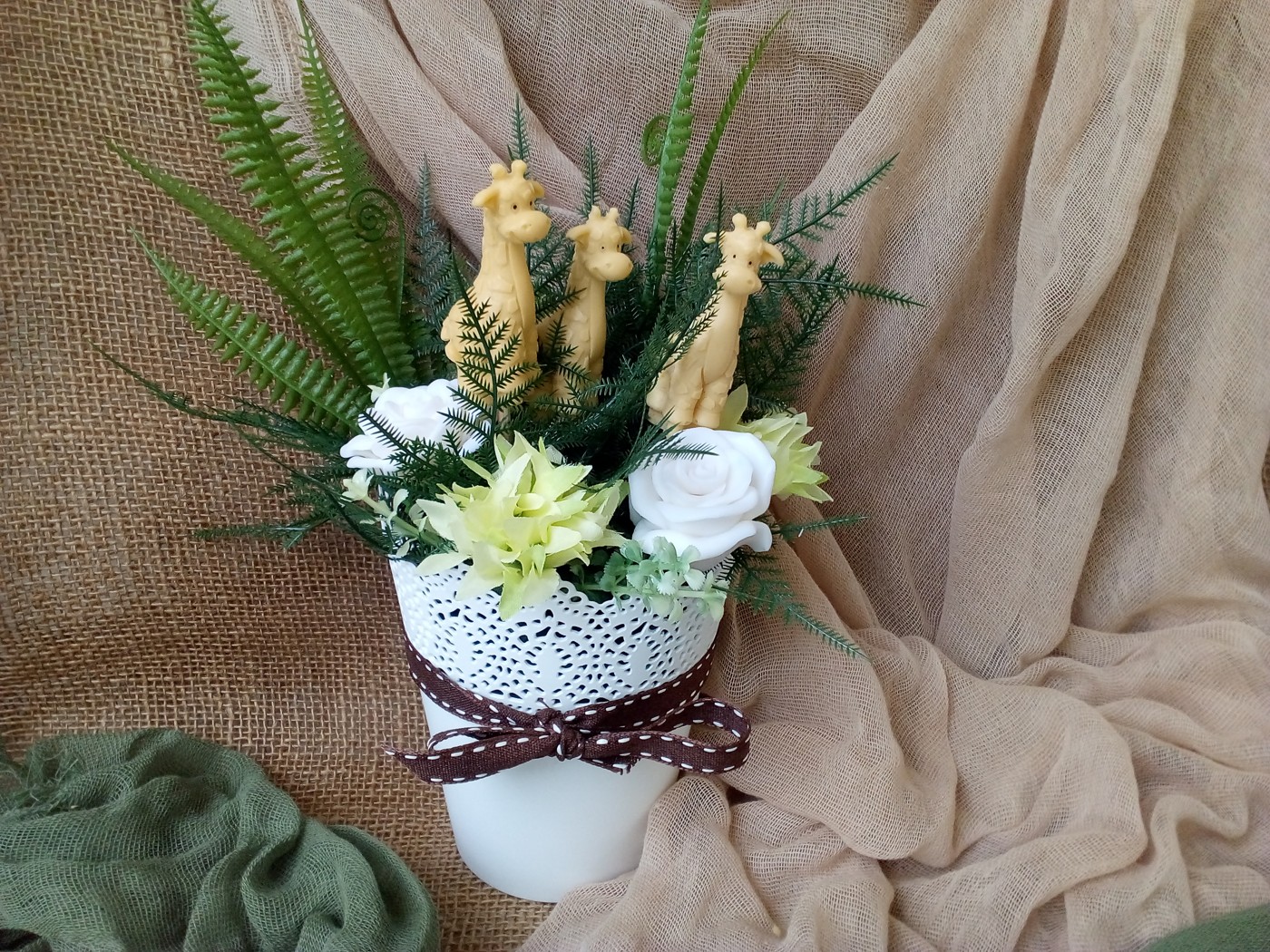 Τέλειο διακοσμητικό για το τραπέζι της βάπτισης! Το κασπώ με λουλούδια και με τις καμηλοπαρδάλεις έρχεται να προσφέρει μία αξέχαστη εμπειρία γεμάτη αρμονία και ομορφιά.