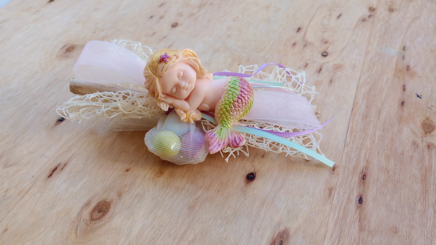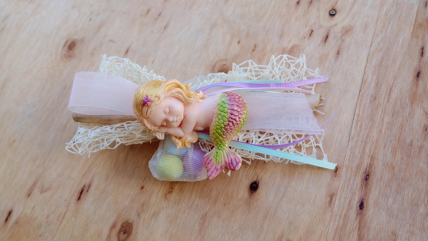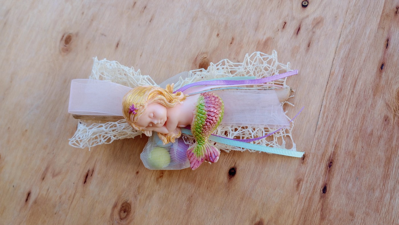Την τύλιξαν κορδέλες σαν πολύχρωμα θαλασσινά φύκια και στο πλευρό της ξεκουράζονται γλυκές ευχές-δεμένες με κουφέτα, σαν πολύτιμα μαργαριτάρια….