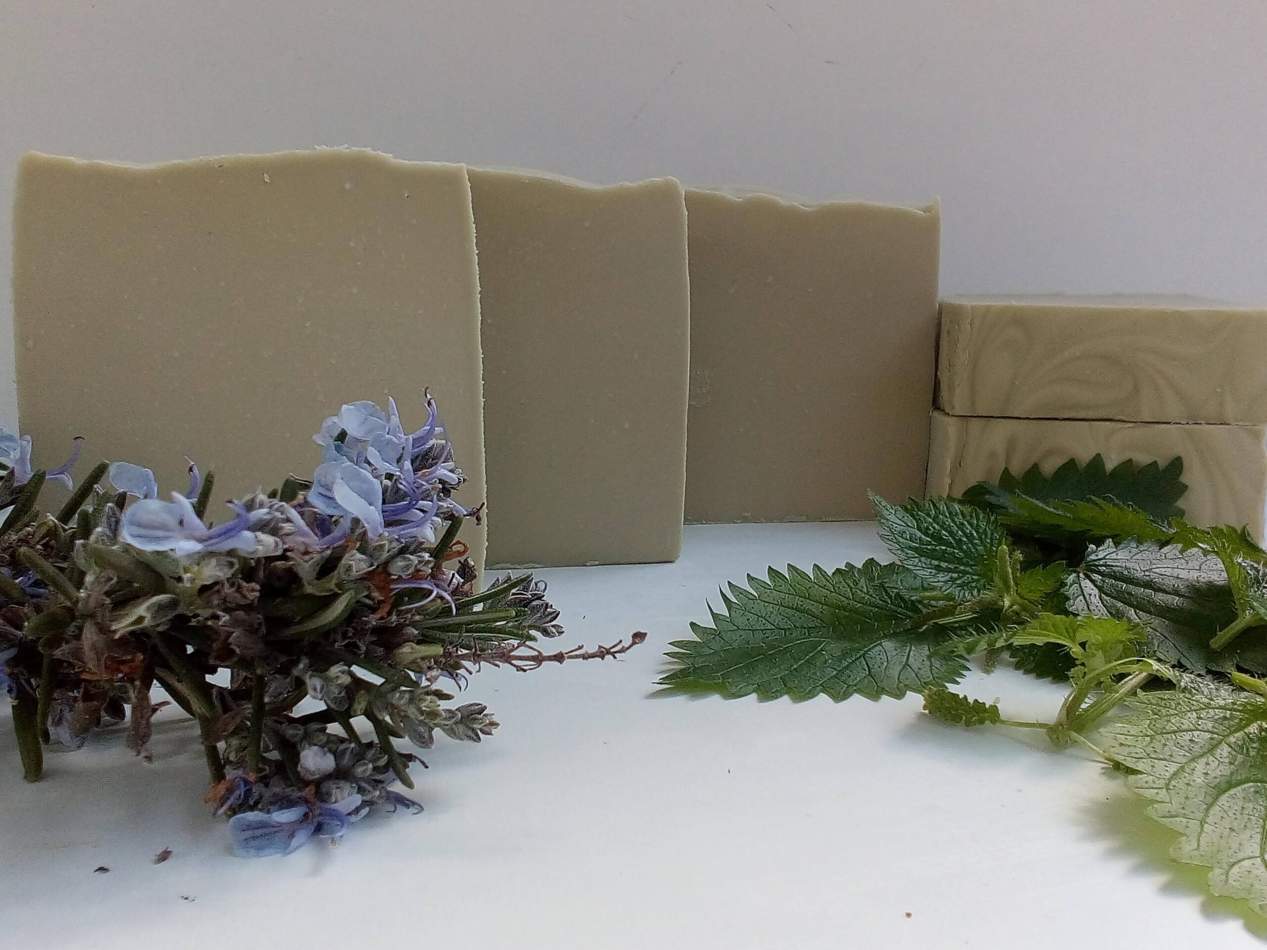 Αγνό χειροποίητο σαπούνι ελαιολάδου, με εκχυλίσματα τσουκνίδας και δεντρολίβανο. Παράγεται με την ψυχρή μέθοδο σαπωνοποίησης και κόβεται στο χέρι. Ιδανικό για την ξηροδερμία και την τριχόπτωση.Η τσουκνίδα τρέφει τις τρίχες των μαλλιών αλλά και το δέρμα του κεφαλιού, είναι τονωτικό, καταπολεμά την πιτυρίδα και το πλεονέκτημα αυτό διπλασιάζεται με το δεντρολίβανο. Η τσουκνίδα τονώνει την ρίζα των μαλλιών, βελτιώνει το τριχωτού της κεφαλής, εμποδίζει και θεραπεύει τη μυκητίαση, έχει στυπτικές και τονωτικές επιδράσεις στο δέρμα. Το δεντρολίβανο έχει ένα αποτέλεσμα καθαριστικό, αντιοξειδωτικό, στυπτικό, επανορθωτικό και επουλωτικό. Διεγείρει την ανάπτυξη των μαλλιών και τα εμποδίζει να μην πέφτουν. Ένα σαπούνι, αντιμικροβιακό και αντιβακτηριακό, κατάλληλο για το πρόσωπο, σώμα και μαλλιά.