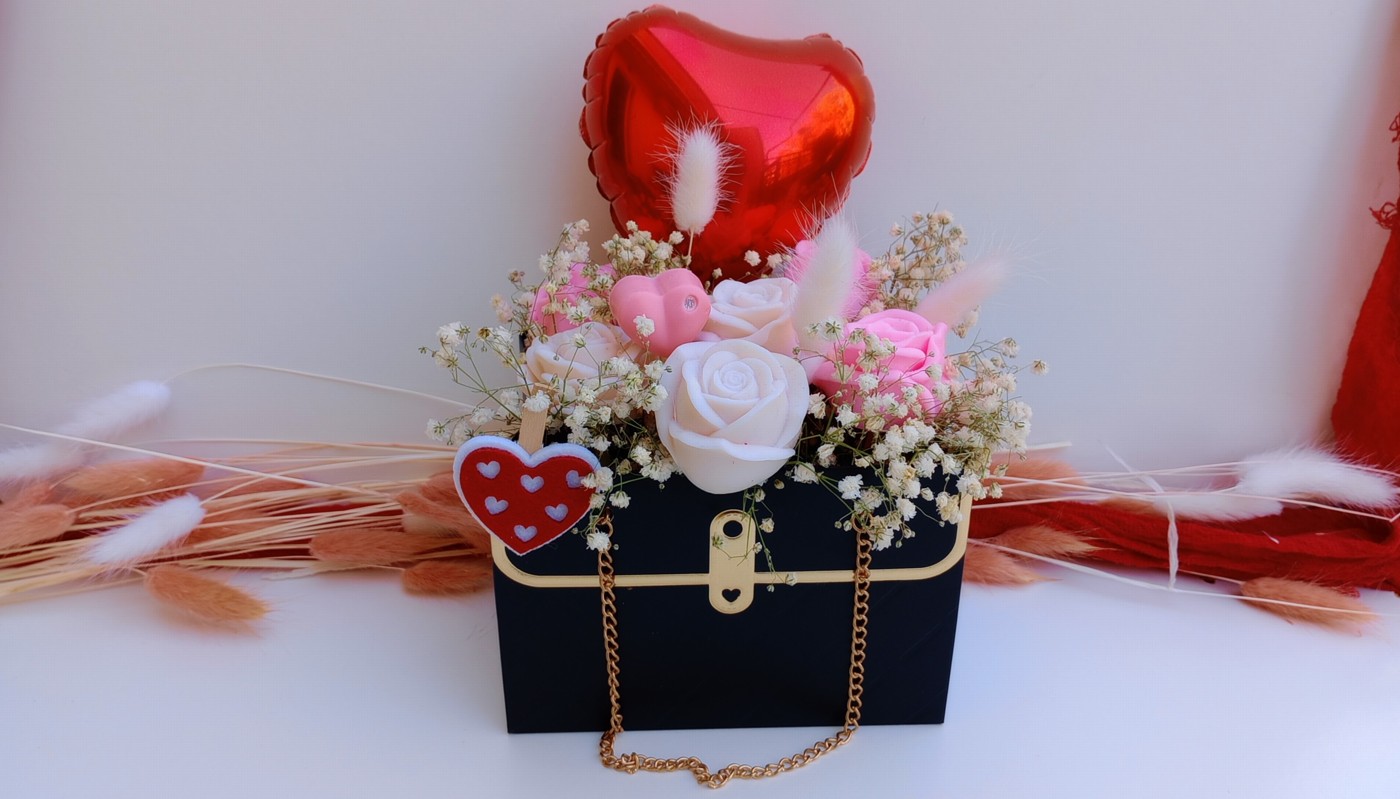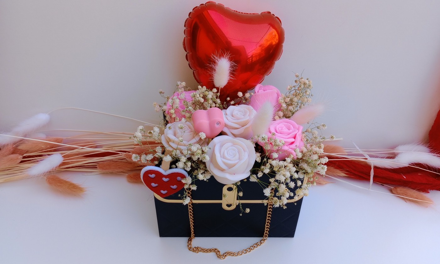 Τριαντάφυλλα από σαπούνι που δεν μαραίνονται, γυψόφυλλο που προσθέτει τρυφερότητα, μία καρδιά από σαπούνι που συμβολίζει την αγνή αγάπη και μία κόκκινη καρδιά μπαλόνι που υψώνεται γεμάτη συναίσθημα….